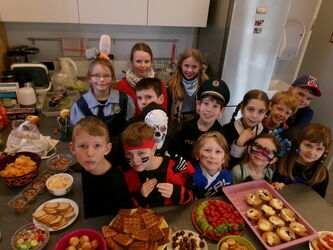 Skelette, Matrosen, Polizisten, Kämpfer, wilde Tiere, Prinzessinnen, Tänzerinnen und …., spazierten zur Rosenmontagsparty gut gelaunt in die Schule. Im Gepäck hatten sie viele Leckereien für unser traditionelles Faschingsbüffet. Wer zusätzlich geschminkt zu werden, oder eine Frisurveränderung wünschte, konnte sich aufhübschen lassen. Fetzige Partymusik lud ein zur Polonaise durchs Schulhaus und beim gemeinsamen Frühstück wurde kräftig vom Büffet geschlemmt. Beim Mumienspiel, Schokolade auspacken, Reise nach Jerusalem und anderen lustige Wettspielen, feuerten sich die Kinder gegenseitig an. Das beliebte Luftballonkissenspiel durfte dabei nicht fehlen. Alle Kinder, mitsamt dem Betreuungsteam, gingen am Ende kaputt und glücklich nach Hause.