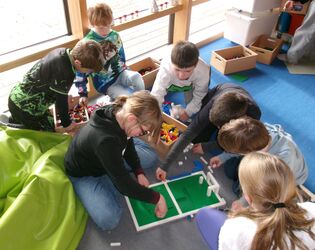 Am Nachmittag stand das Gemeinschaftsprojekt Lego auf dem Programm. Nachdem sich die Kinder auf den Bau eines Fußballstadions geeinigt hatten, ging es los mit der Farbsortierung der Legosteine. Ein tolles Stadion mit Videoschiedsrichter, Zuschauern, einem goldenen Tornetz und Werbebanden kam am Ende dabei heraus. Das Stadion erhielt den Namen: Schillerstadion Ingersheim.