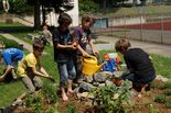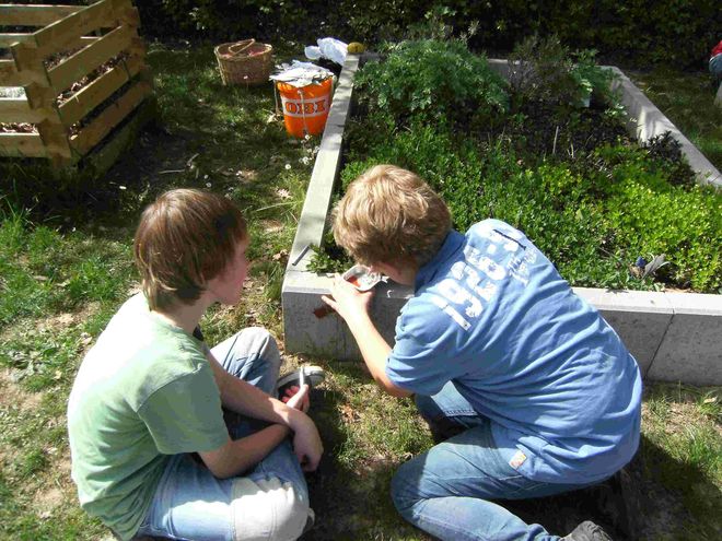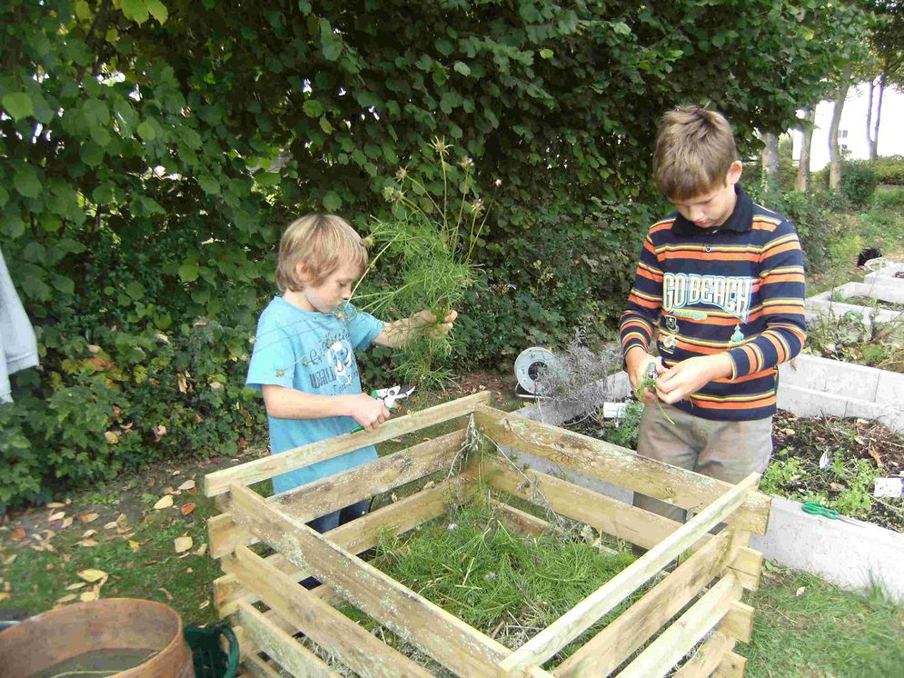 Außerdem stellten wir einen Kompost auf, in den wir in Zukunft unsere Grünabfälle werfen. Mit dem darin entstehenden Humus wollen wir die Erde in unseren Beeten verbessern.