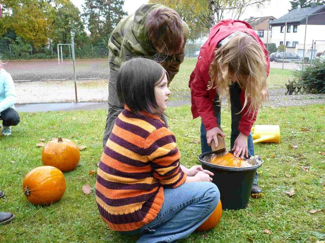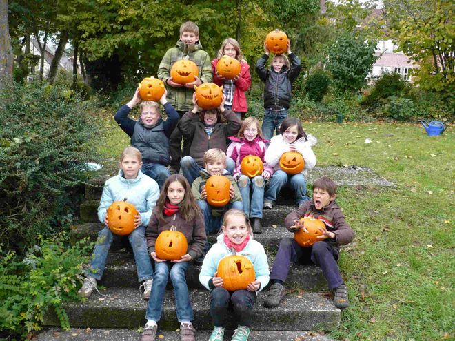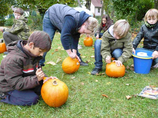 Pünktlich zu Halloween haben wir aus Kürbissen Geister geschnitzt. Jeder von uns durfte mit einem speziellen Schnitzwerkzeug einen Kürbis bearbeiten. Zuerst mussten wir oben einen Deckel herausschneiden. Anschließend höhlten wir den Kürbis aus, indem wir mit einem Löffel aus dem Inneren alle Fasern und Kerne entfernten. Am Schluss sägten wir Gesichter in die Kürbisse. Es entstanden freundliche, gruselige und lustige Kürbisgesichter.