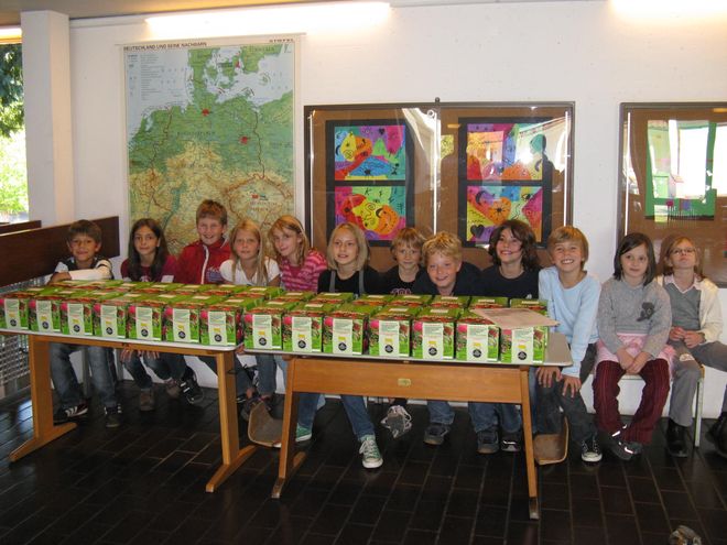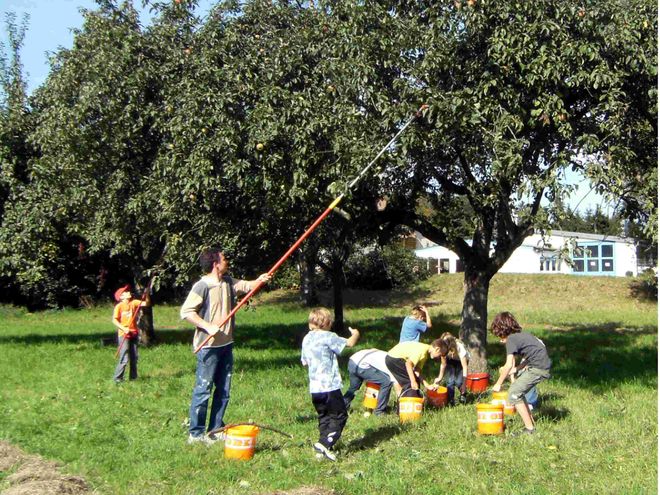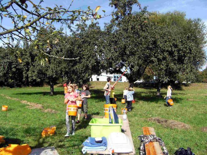Im Oktober ernteten wir auf den Streuobstwiesen im Wiesental Äpfel. Mit Apfelbrechern, Holzstangen und Eimern gingen wir bei schönstem Herbstwetter ans Werk. In Windeseile waren mehrere Zentner Äpfel aufgelesen. Die ganze Ernte wurde einige Tage später auf dem Fischerwörthparkplatz vom Saftmobil zu leckerem Apfelsaft verarbeitet. Jeder Schüler der bei der Ernte mitgeholfen hatte, bekam einen 5l-Karton Apfelsaft. Außerdem erhielt jede Schulklasse der Schillerschule einen Karton mit Apfelsaft.
