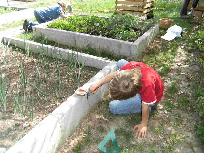 Weil die Beetumrandungen der Gemüsebeete sehr trist aussahen beschlossen wir sie gemeinsam mit Naturfarben zu bemalen. Zuerst stellten wir aus Pappkarton Schablonen mit passenden Motiven (Marienkäfer, Grashüpfer, Igel…….) her. Nachdem die Schablonen auf den Beeteinfassungen übertragen waren, malten wir sie mit den selbst hergestellten Naturfarben aus.