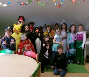 Skelette, Matrosen, Polizisten, Kämpfer, wilde Tiere, Prinzessinnen, Tänzerinnen und …., spazierten zur Rosenmontagsparty gut gelaunt in die Schule. Im Gepäck hatten sie viele Leckereien für unser traditionelles Faschingsbüffet. Wer zusätzlich geschminkt zu werden, oder eine Frisurveränderung wünschte, konnte sich aufhübschen lassen. Fetzige Partymusik lud ein zur Polonaise durchs Schulhaus und beim gemeinsamen Frühstück wurde kräftig vom Büffet geschlemmt. Beim Mumienspiel, Schokolade auspacken, Reise nach Jerusalem und anderen lustige Wettspielen, feuerten sich die Kinder gegenseitig an. Das beliebte Luftballonkissenspiel durfte dabei nicht fehlen. Alle Kinder, mitsamt dem Betreuungsteam, gingen am Ende kaputt und glücklich nach Hause.